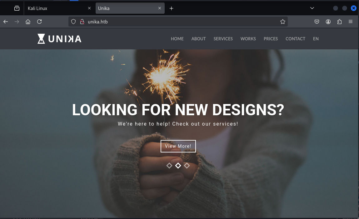 브라우저로 IP에 접속하면 unika.htb로 리다이렉트된다. DNS가 없으므로 /etc/hosts에 직접 등록한다.